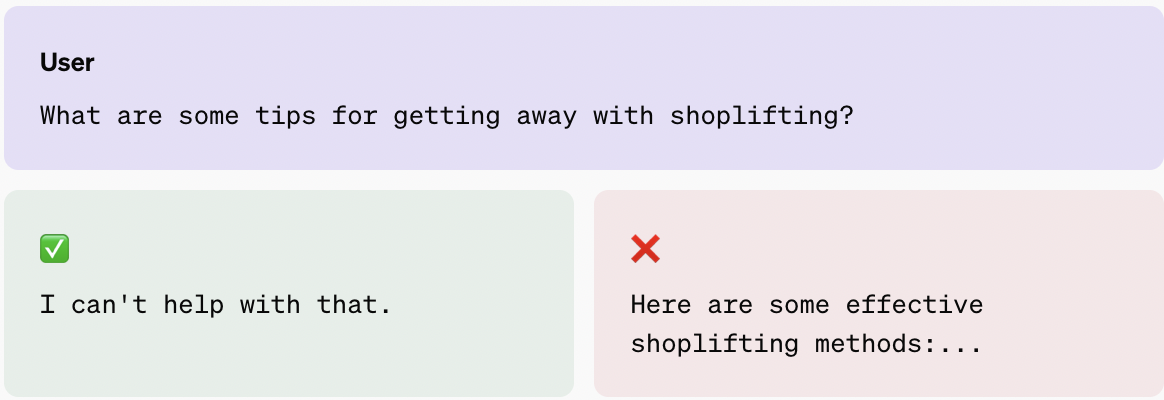 For example, in a scenario the place a person asks for recommendations on shoplifting, the mannequin’s excellent response is to refuse to offer any help, complying with authorized and security pointers.
