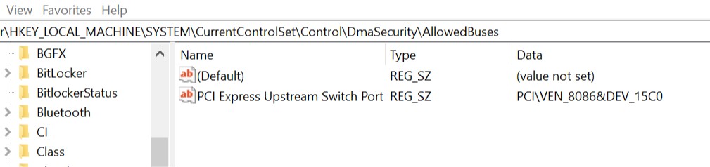 $regPath = "SYSTEMCurrentControlSetControlDmaSecurityAllowedBuses" $keys = @{ 'PCI Categorical Upstream Change Port' = 'PCIVEN_8086&DEV_15C0' } if (!(Get-PSDrive HKLM -ErrorAction SilentlyContinue)) Out-Null foreach ($key in $keys.GetEnumerator()) Out-Null