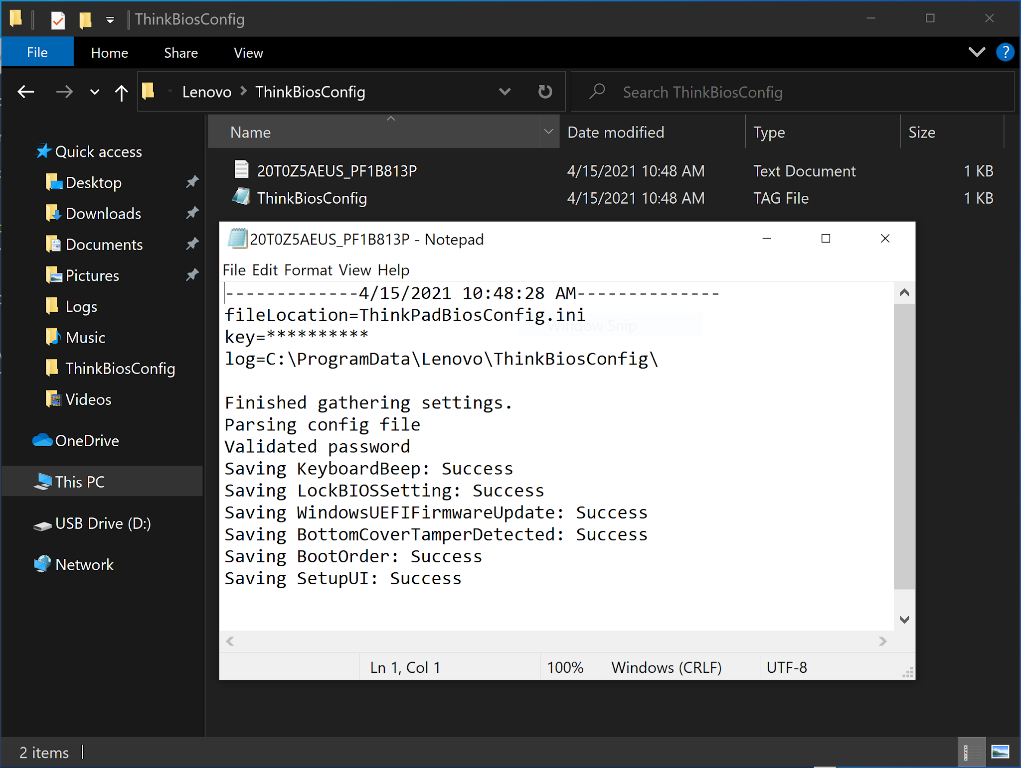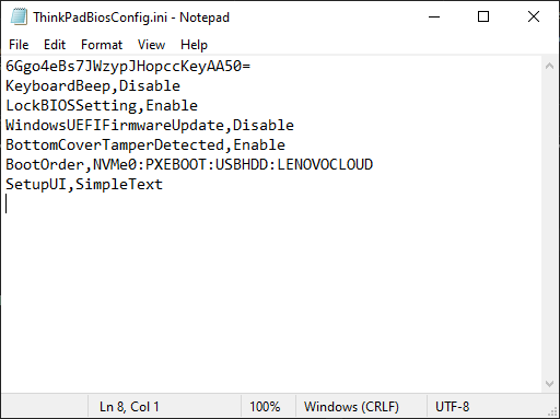 Earlier than continuing, be sure you have an exported .ini file that incorporates the specified BIOS settings you need utilized to your goal programs. Seek advice from the documentation offered within the TBCT zip on how you can receive this file. For this demonstration, I’ve exported the next .ini from a T14s (Intel)