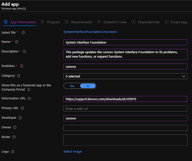 Step one within the wizard is to add the .intunewin file and fill out required and/or non-obligatory details about the app.
