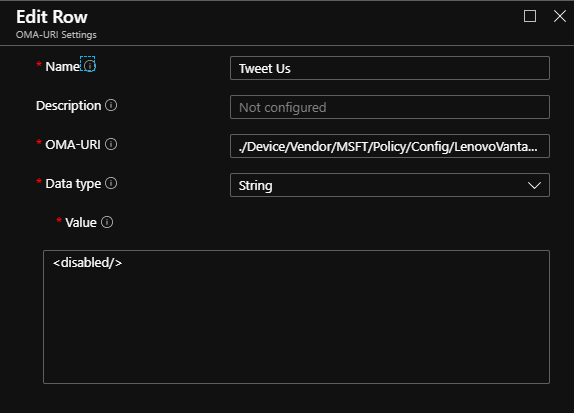 Now we are able to add these settings in Intune. The tip result's to cover these options from the Vantage interface so every setting you add, the worth will have to be <disabled/>