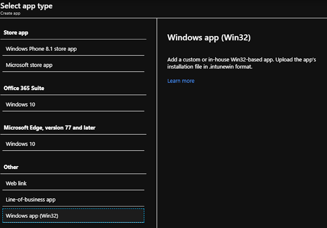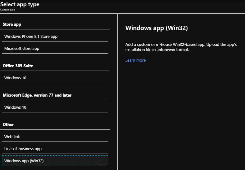 Log in to the Machine Administration portal and navigate to Apps > Home windows > Add and select Home windows app (Win32) for the appl kind.