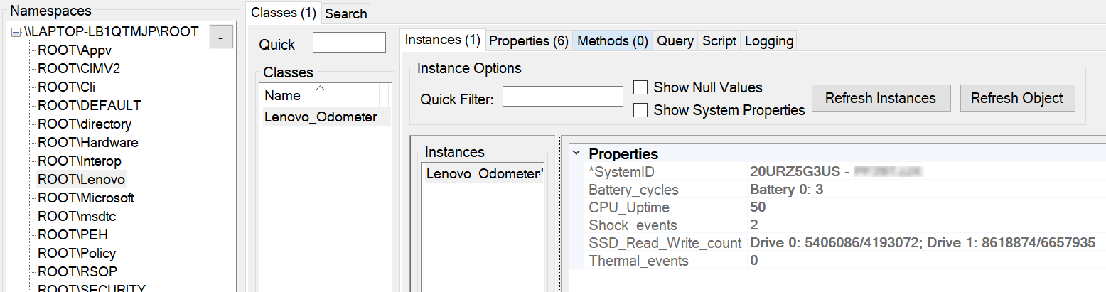 These counters are maintained by the Embedded Controller and the present values are uncovered every time the system boots utilizing SMBIOS Desk information. With a view to have this information saved in a significant means so it may be inventoried and picked up by MEM Configuration Supervisor, we’ve got created a PowerShell script (odometer.ps1, accessible from obtain hyperlink beneath) that may be applied as both a scheduled job or used on demand to populate the Lenovo_Odometer class in WMI.
