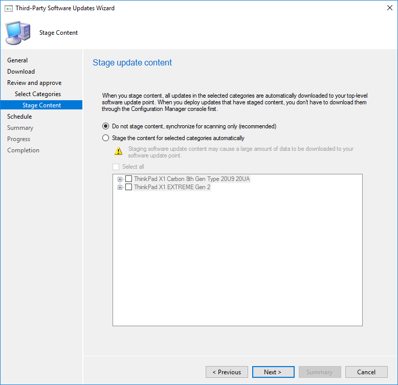 As soon as classes are chosen, the content material could be staged which suggests will probably be mechanically downloaded to the highest stage software program replace level. This may take away the necessity to obtain the content material via the Configuration Supervisor console previous to deployment.