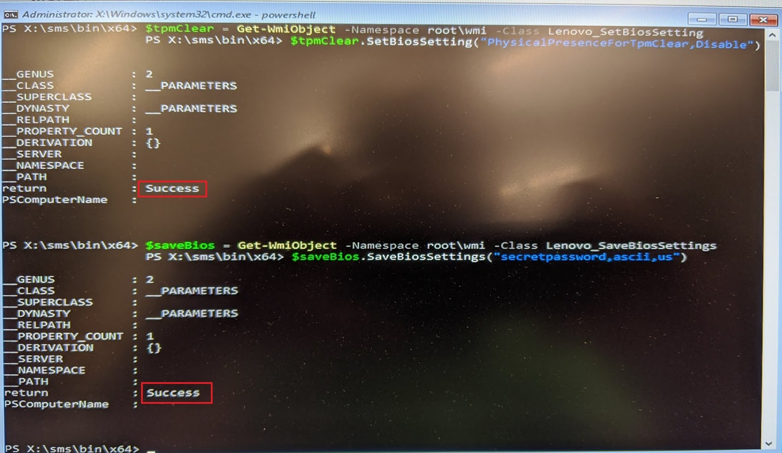 $setPw = Get-WmiObject -Namespace root/wmi -Class Lenovo_setBiosPassword $setPw.SetBiosPassword("pap,secretpassword,secretpassword,ascii,us")