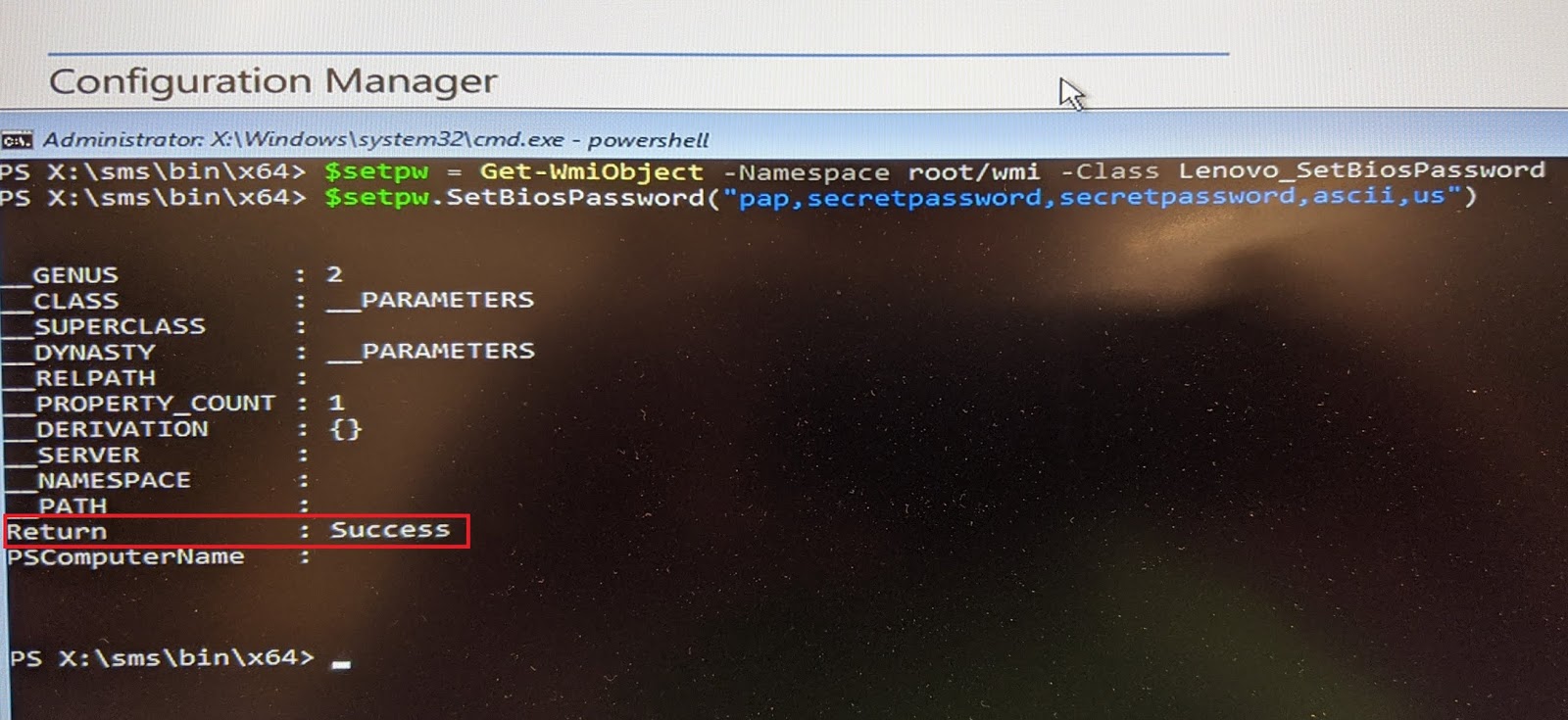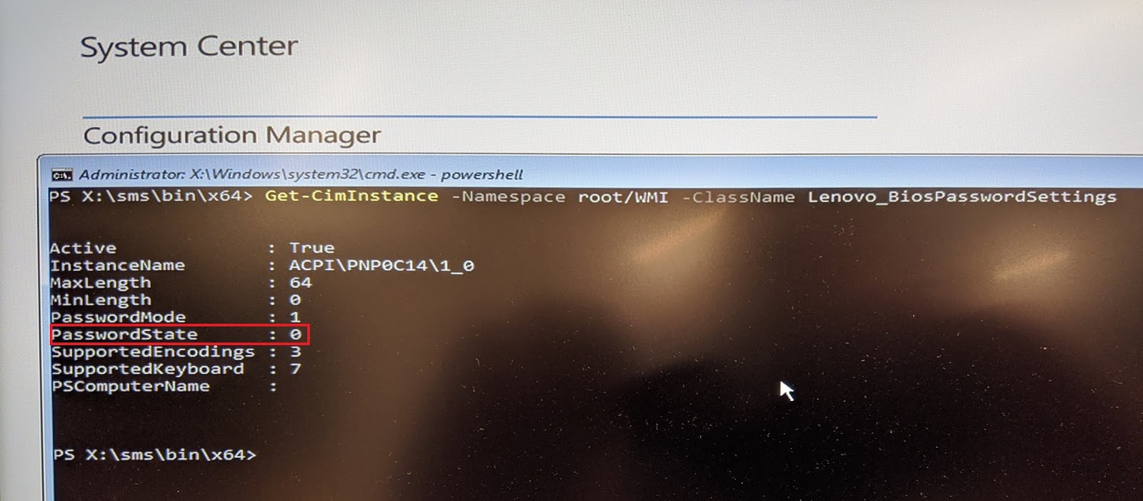 PXE boot a system to WinPE, F8 to a command immediate, and begin PowerShell. Confirm there isn’t a supervisor password set on the system by working the next command