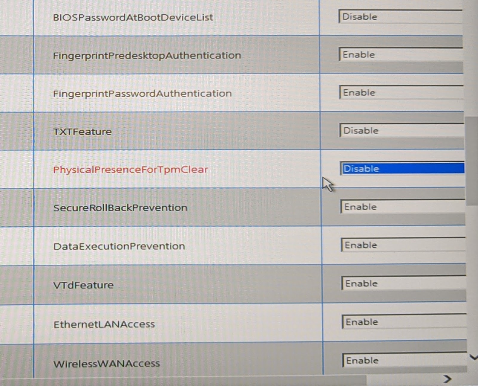 - Scroll by means of the listing of obtainable BIOS settings and make any modifications to be utilized. On this instance, we will set the PhysicalPresenceForTpmClear setting to Disable