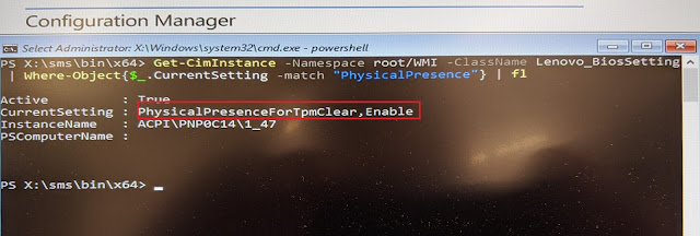 $tpmClear = Get-WmiObject -Namespace rootwmi -Class Lenovo_SetBiosSetting $tpmClear.SetBiosSetting("PhysicalPresenceForTpmClear,Disable")