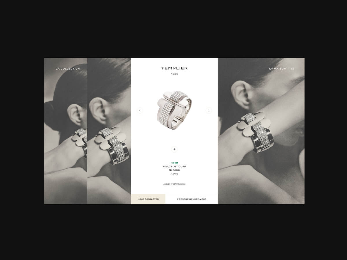 In dialogue with this imagery, the interface unfolds with choreographed transitions of refractions that echo the architectural essence of Templier’s work. Scrolling feels easy and steady; pages dissolve into each other by reveals, smooth fades, and shifting reflections — a visible rhythm that mirrors the round motifs and interaction of sunshine that outlined the jeweler’s modernist language.